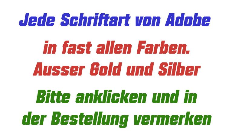 Wählen Sie eine Schriftart von Adobe und die Wunschfarbe für den Druck. Leider können Gold und Silber nicht gedruckt werden.