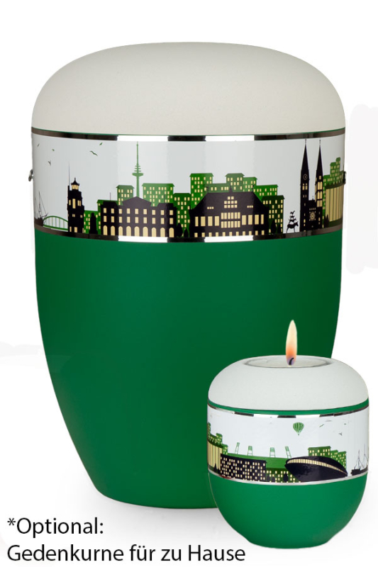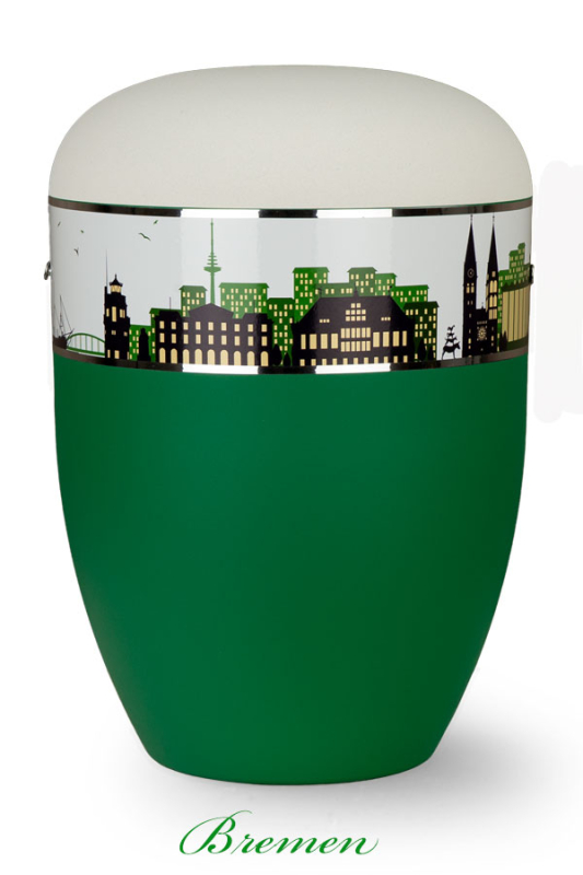 Bio-Urne Bremen Fan in den Farben grün und weiß. Der untere Teil dieser Urne ist grün gefärbt und der Deckel ist weiß. Unterbrochen werden die Bremer Farben durch einen Ring, der die Bremer Skyline als Silhouette darstellt. Die Urne Bremen wird aus Naturstoffen hergestellt. Urnen dieser Güte findet man auch unter dem Begriff Öko-Urne und Bio-Urne. Bio Urnen können im Ruheforst oder Baumfriedhof beigesetzt werden.