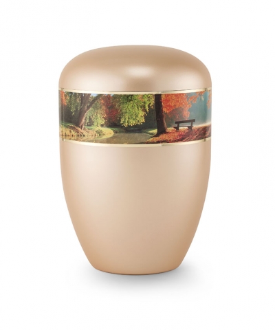 Bio-Urne mit einer apricot-gold Perlmutt Oberfläche trägt ein in Gold gefasstes Zierband mit einem stimmungsvollen Motiv, Bank am Fluß. Weitere Motive der Urnen Serie Edition 360 Grad könnten auch von Interesse sein.