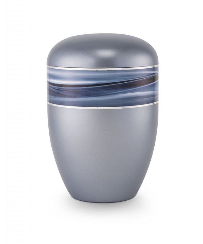 Die Perlmutt hellgraue Urne hat ein modernes Wellendekor, farblich der Urne angepasst. Das verwendete Material gehört zu den vergänglichen Naturstoffen. Bio Urne stahlgrau, weitere Farben der Edition Wave finden Sie unter unseren Empfehlungen.