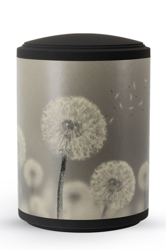 Die Pflanzenfaseroberfläche ist bei dieser Naturstoff Urne mit einem Motiv aus Pusteblumen großflächig bedruckt. Alle Urnen der Edition Ventura Fiore sind auch für den FriedWald geeignet und erlaubt.