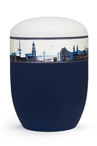 Seeurne Hamburg in den Farben weiß und blau. Der untere Teil dieser Seeurne ist dunkelblau gefärbt und der Deckel ist weiß matt. Unterbrochen werden die Farben durch einen Ring, der die Hamburger Skyline als Silhouette darstellt. Die Seeurne Hamburg wird aus wasserlöslichen Material hergestellt. Seeurnen dieser Güte sind für die Seebestattung in der Nordsee und Ostsee zugelassen.