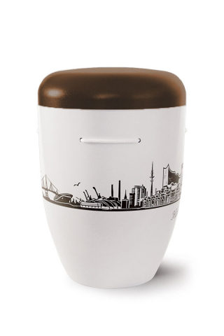 Seiner Stadt verbunden, Naturstoff Urne in weiß mit braunem Oberteil. Die Skyline wird mit einem Laser in den Korpus der Urne graviert. Mit der Urnen Serie "Heimathafen Hamburg" erfüllen wir denen einen Wunsch, die sich ihrer Stadt verbunden fühlen und fühlten. Wir Hamburger bezeichnen unsere Stadt auch als die schönste Stadt der Welt. Die Urnen Serie Heimathafen gibt es auch noch in anderen Farbabstufungen, diese finden Sie unter unseren Empfehlungen.