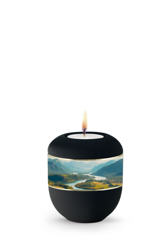 Andenken Urne schwarz Band aus Pflanzenfasern Abendfluss Motiv mit Teelicht