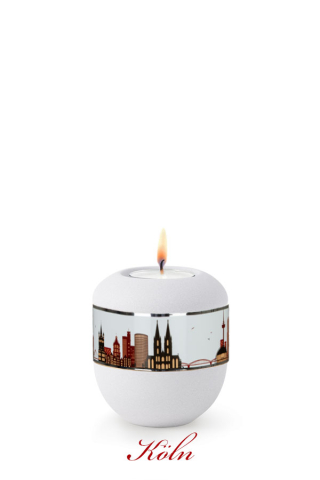 Andenken Urne für zu Hause in weiß mit der Köln Skyline und Teelicht. Kleine Gedenkurne mit Teelicht für zu Hause. In Kleinurnen können Erinnerungen des Verstorbenen aufbewahrt werden, nicht nur Asche. Die Andenken Urne U Köln Weiss Gedenk mit Teelicht wird aus Porzellan hergestellt. Weitere Kleinurnen und die passenden großen Urnen aus dieser Serie finden Sie unter unseren Empfehlungen.| Höhe: | 9 cm |