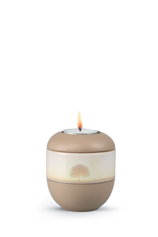 Andenken Urne für zu Hause in karamell seidenglänzend mit Motivband Baum und Teelicht. Kleine Gedenkurne mit Teelicht für zu Hause. In Kleinurnen können Erinnerungen des Verstorbenen aufbewahrt werden, nicht nur Asche. Die Andenken Urne P302FL mit Teelicht wird aus Porzellan hergestellt. Weitere Kleinurnen und die passenden großen Urnen aus der Edition Harmony finden Sie unter unseren Empfehlungen.Höhe: | 9 cm |