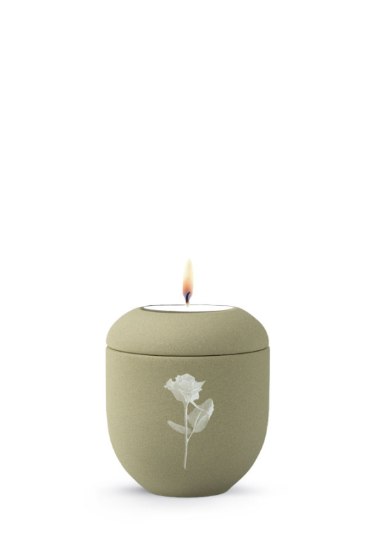 Andenken Urne für zu Hause in olivgrau samtiert mit Rose und Teelicht. Kleine Gedenkurne mit Teelicht für zu Hause. In Kleinurnen können Erinnerungen des Verstorbenen aufbewahrt werden, nicht nur Asche. Die Andenken Urne P3481L mit Teelicht wird aus Porzellan hergestellt. Weitere Kleinurnen und die passenden großen Urnen aus der Edition By Nature finden Sie unter unseren Empfehlungen.Höhe: | 9 cm |