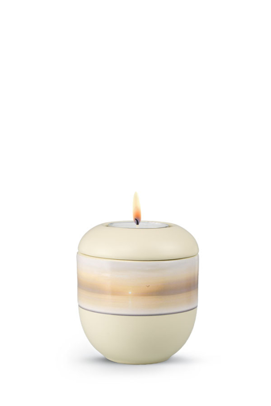 Andenken Urne für zu Hause in vanille seidenglänzend mit Motivband vanille Sonnenuntergang im Meer und Teelicht. Kleine Gedenkurne mit Teelicht für zu Hause. In Kleinurnen können Erinnerungen des Verstorbenen aufbewahrt werden, nicht nur Asche. Die Andenken Urne P303FL mit Teelicht wird aus Porzellan hergestellt. Weitere Kleinurnen und die passenden großen Urnen aus der Edition Harmony finden Sie unter unseren Empfehlungen.Höhe: | 9 cm |