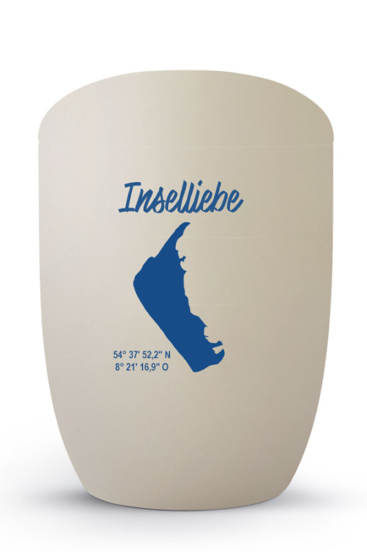 Seeurne creme mit Amrum Silhouette ausgefüllt mit den Koordinaten und Text InselLiebe, Text und Grafik in Friesenblau. Seeurnen aus der Edition InselLiebe sind aus Anhydrid - Tonolith hergestellt. Anhydrit und Tonolith sind wasserlöslich und für die Seebestattung in Nord- und Ostsee zugelassen.