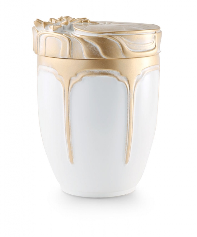 Günstige Seeurne in weiß mit goldenem Seerosenmotiv. Die Urne wird aus Tonolith hergestellt.