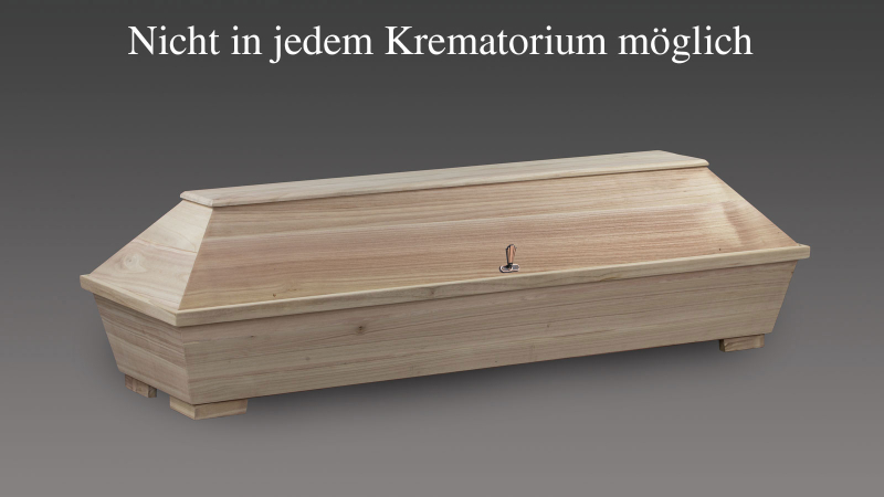 schlichter Sarg aus leichtem Paulowniaholz gefertigt. Durch die feine und glatte Struktur des Holzes ist dieser Sarg ideal geeignet um ihn zu bemalen. Innen ausgeschlagen mit Öko-Textilien in Naturfarben. Dieser Sarg wird durch seinen geringen Brennwert von einigen Krematorien nicht gerne angenommen.