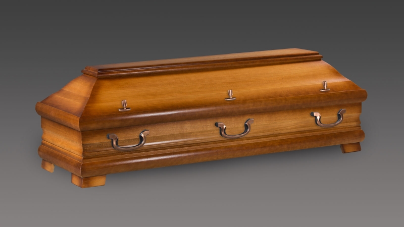 Modell 98, massive Sargtruhe aus Eichenholz, Oberfläche bernstein Beizung und lasiert. Harmonische Formgebung, die den heutigen Sarg Standard in den modernen Sargformen prägen.